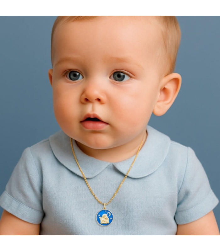 - Medalla oval fabricada en oro amarillo de primera ley 750 mlsm (18 quilates)  con Ángel de la Guarda