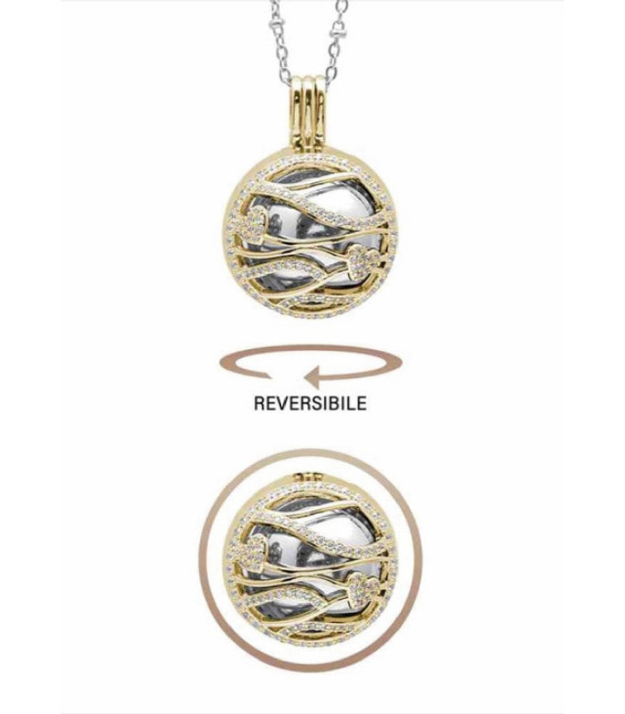 Collar de embarazo / llamador de ángeles Sonido de Vida con Corazones en latón dorado y circonitas con bola sonora rodiada (Ø18 mm) y cadena de acero ajustable 90+10cmSus datos :