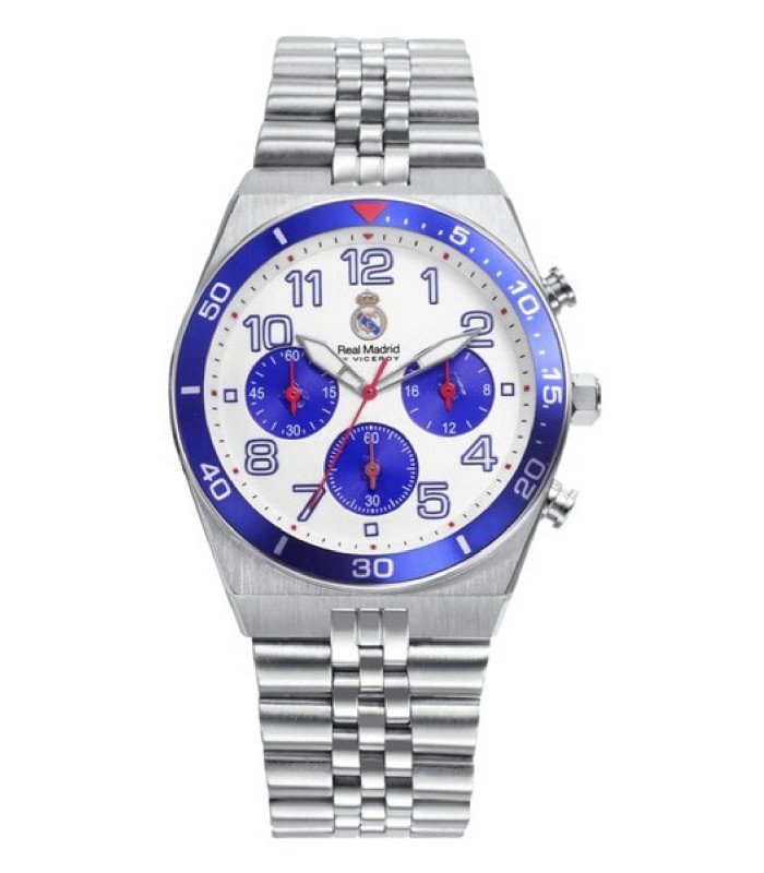 Reloj de Hombre Viceroy Real Madrid 41171-05, cronómetro, caja con bisel azul y brazalete de acero, esfera blanca con subesferas en color azul e indicadores en color blanco.