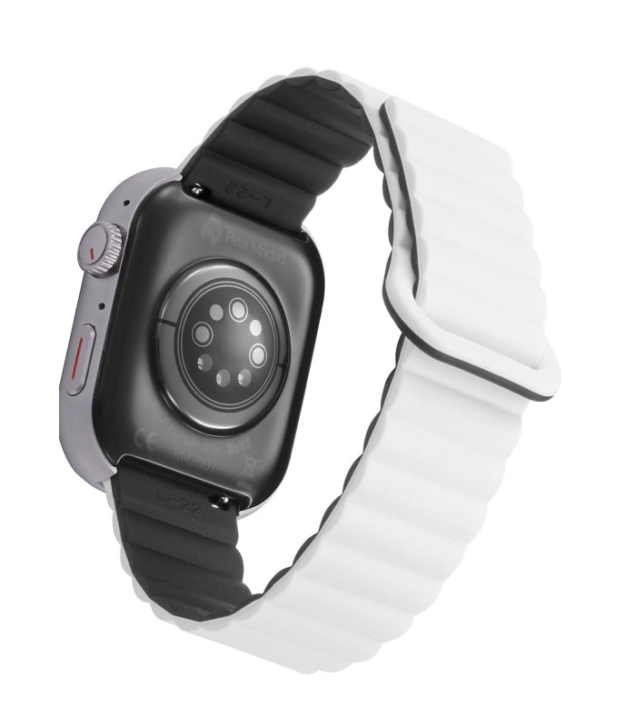 Smartwatch Real Madrid RM2007-10 Smart, caja metálica plateada, trasela de policarbonato negra y correa de silicona blanca y negra, pantalla táctil, son compatibles con teléfonos con un sistema Android 12+ o iOS 17+