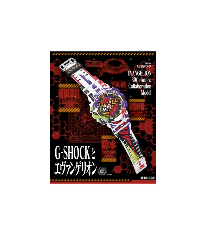 - EVANGELION X G-SHOCK 30TH GA-110EVA30-7AER. En colaboración con CASIO y Evangelion llega para celebrar los 30 años de una de las series más icónicas del anime japonés. Esta colaboración especial cuenta con el diseño exclusivo de Ikuto Yamashita, el legendario diseñador mecánico detrás del universo EVANGELION.